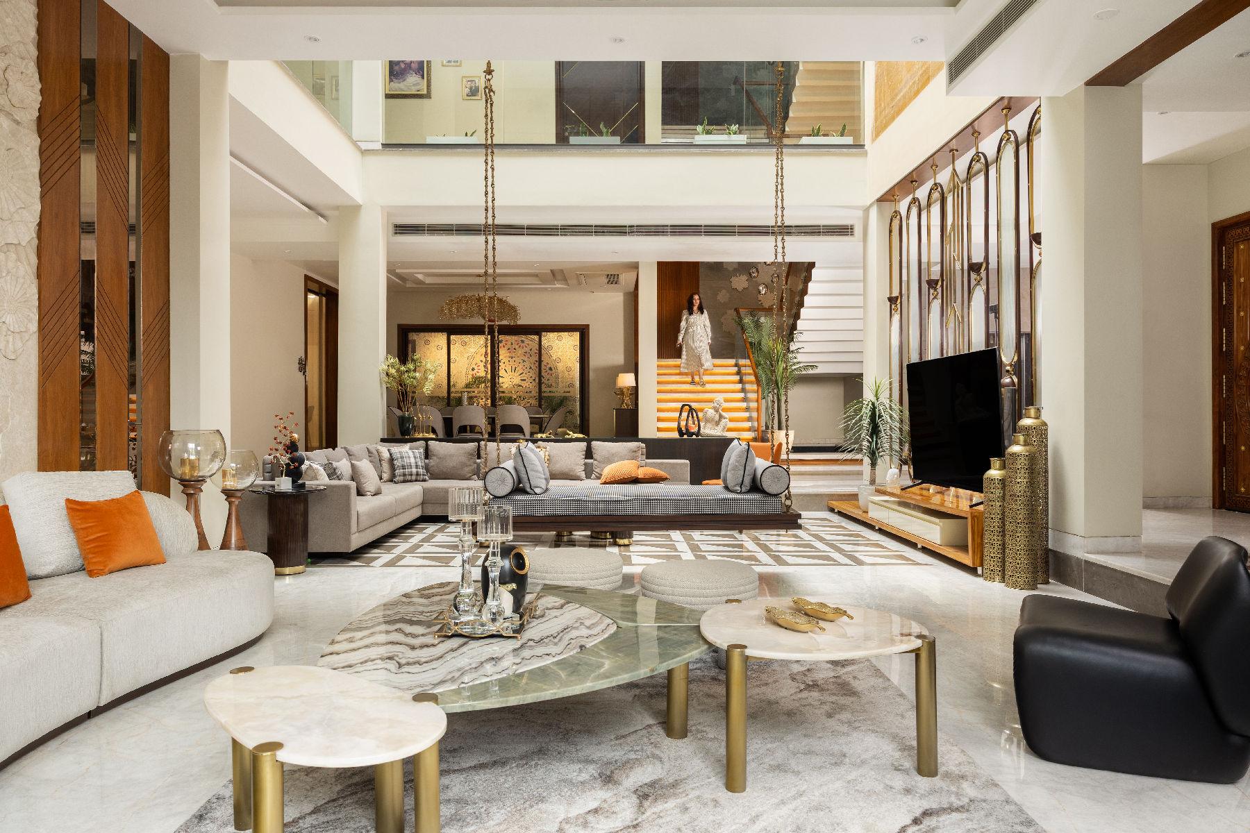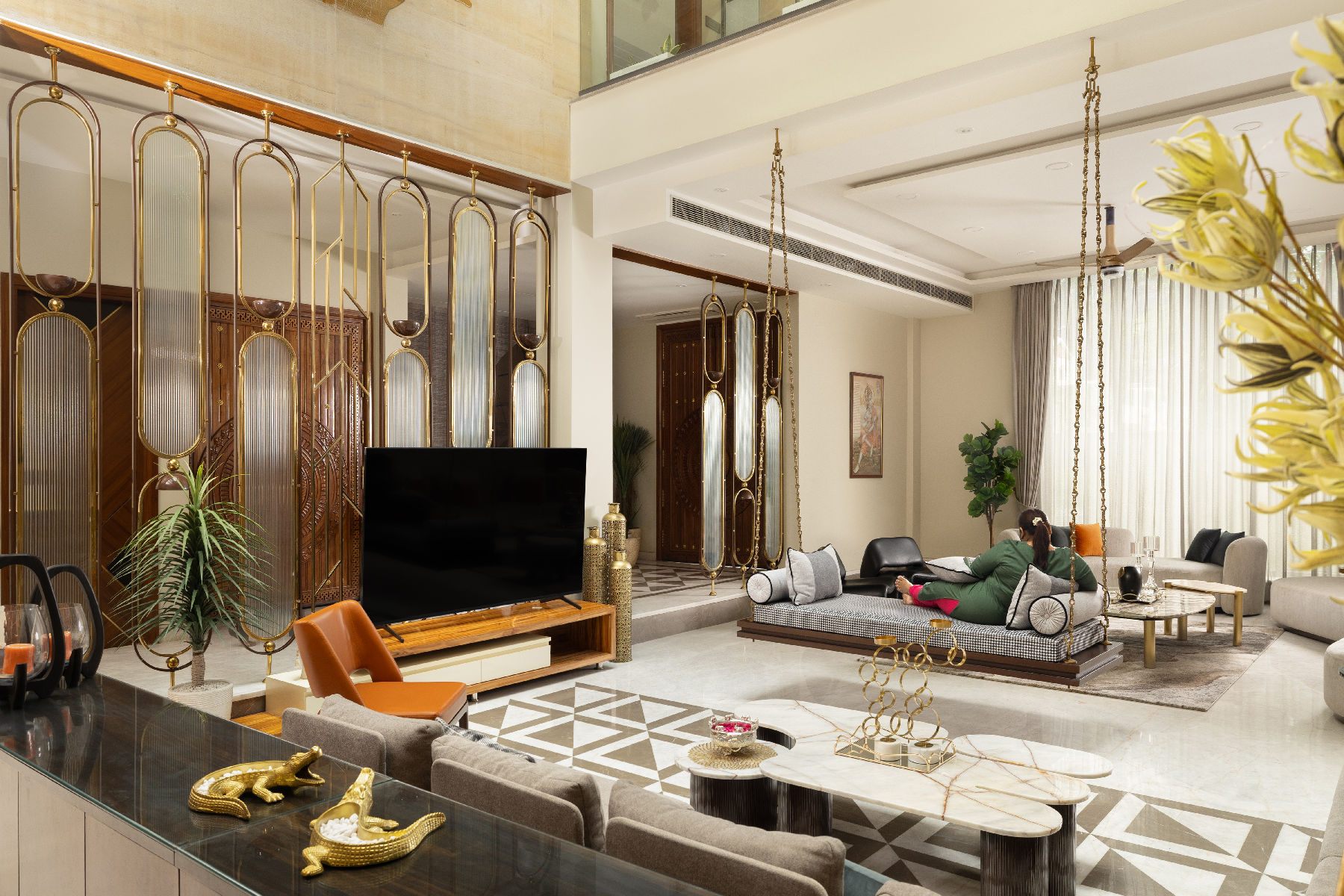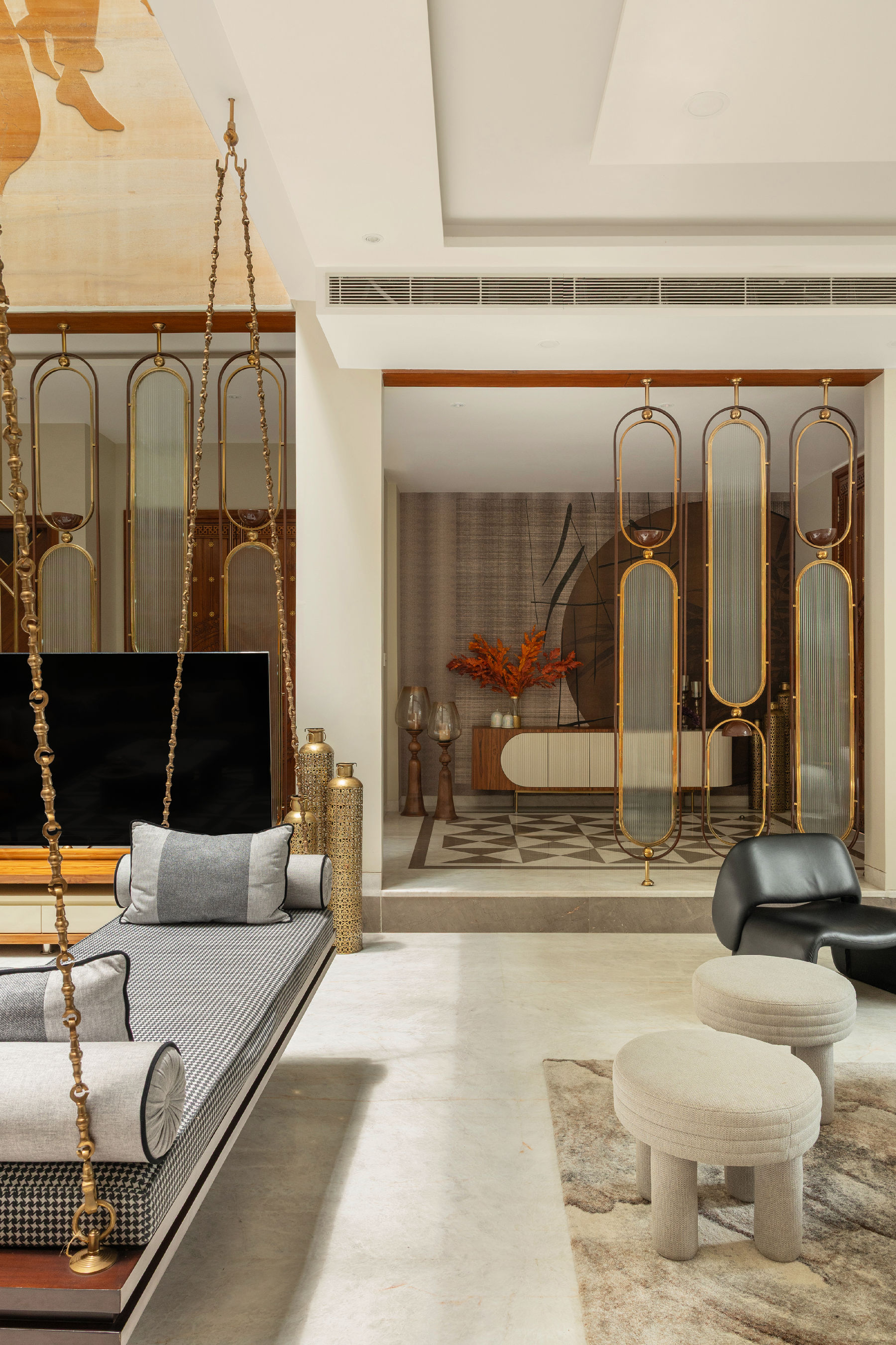 The jhoola became the centrepiece of the double-height living space, framed by a mix of stone walls, intricate floor inlays, warm veneers, matte brass details, wall murals, mirrors, and textured finishes. The formal living room retained a stately elegance, while the lounge invited relaxation, all tied together with cohesive styling.