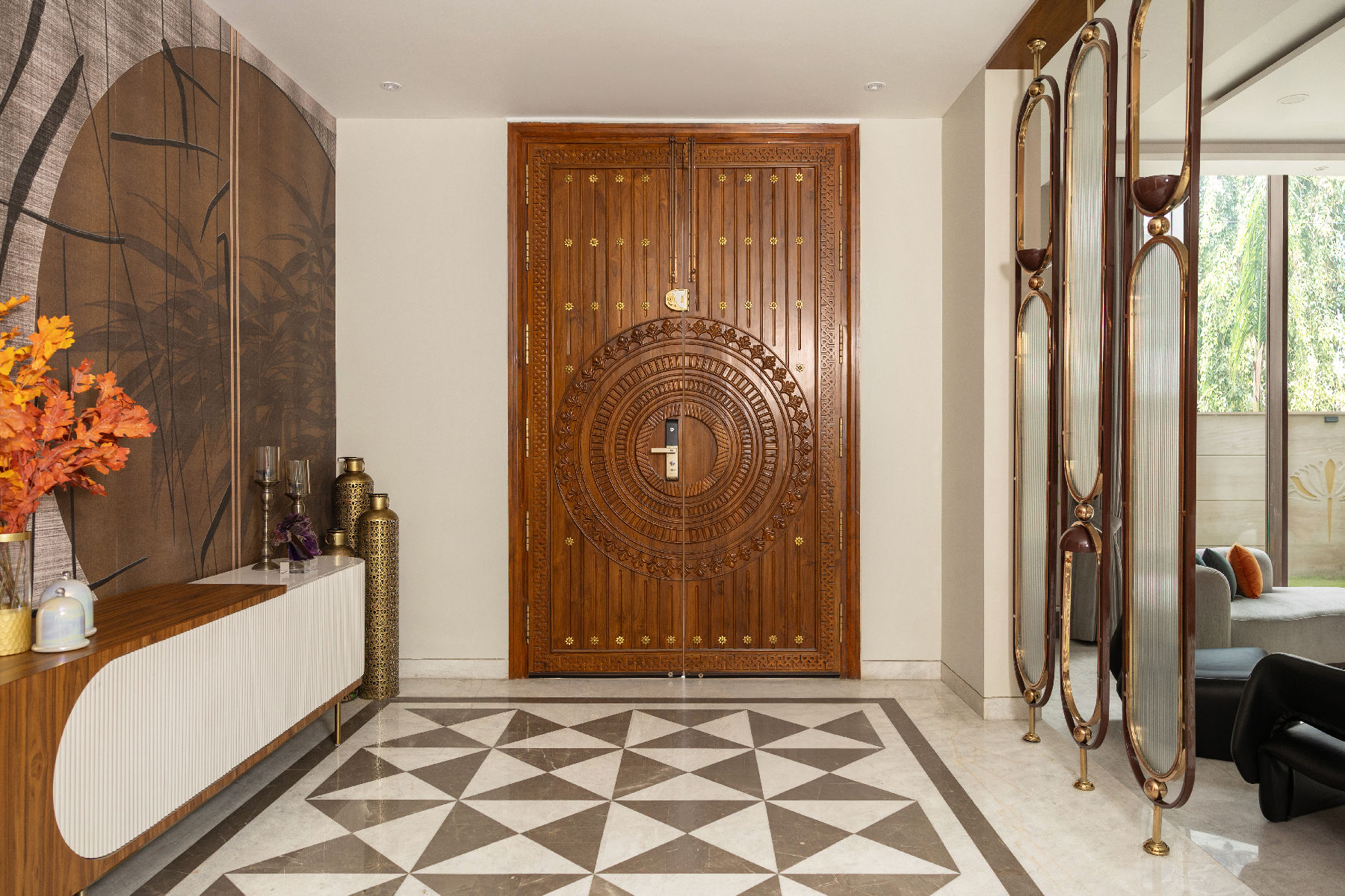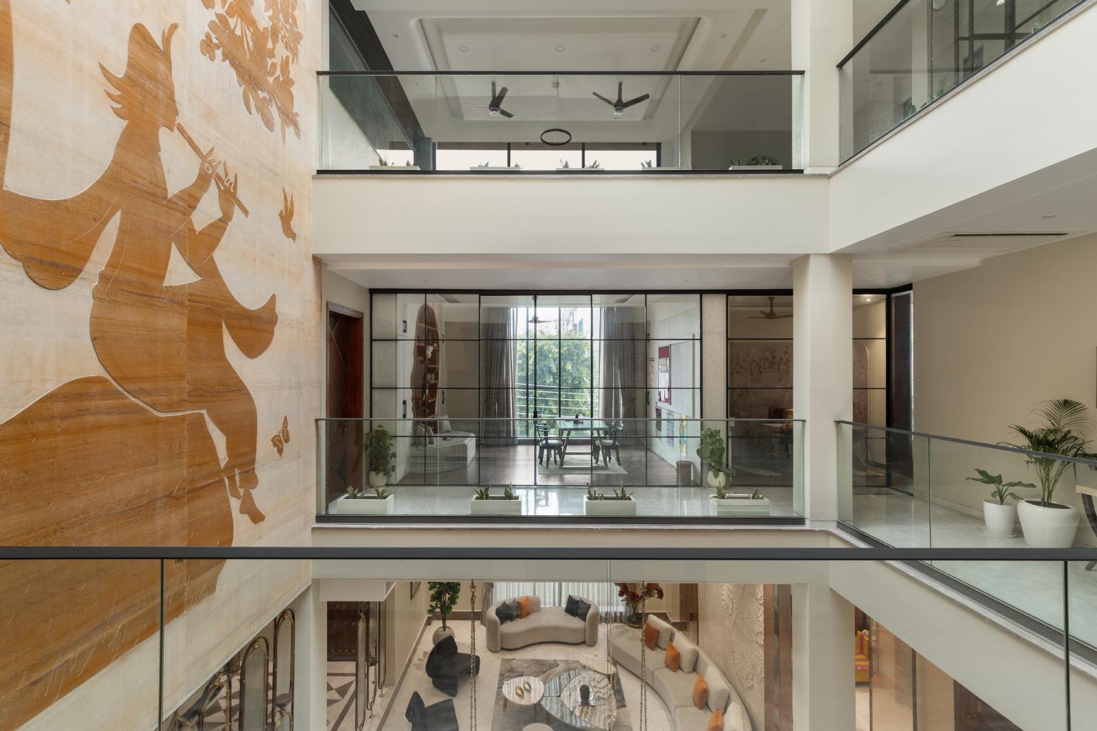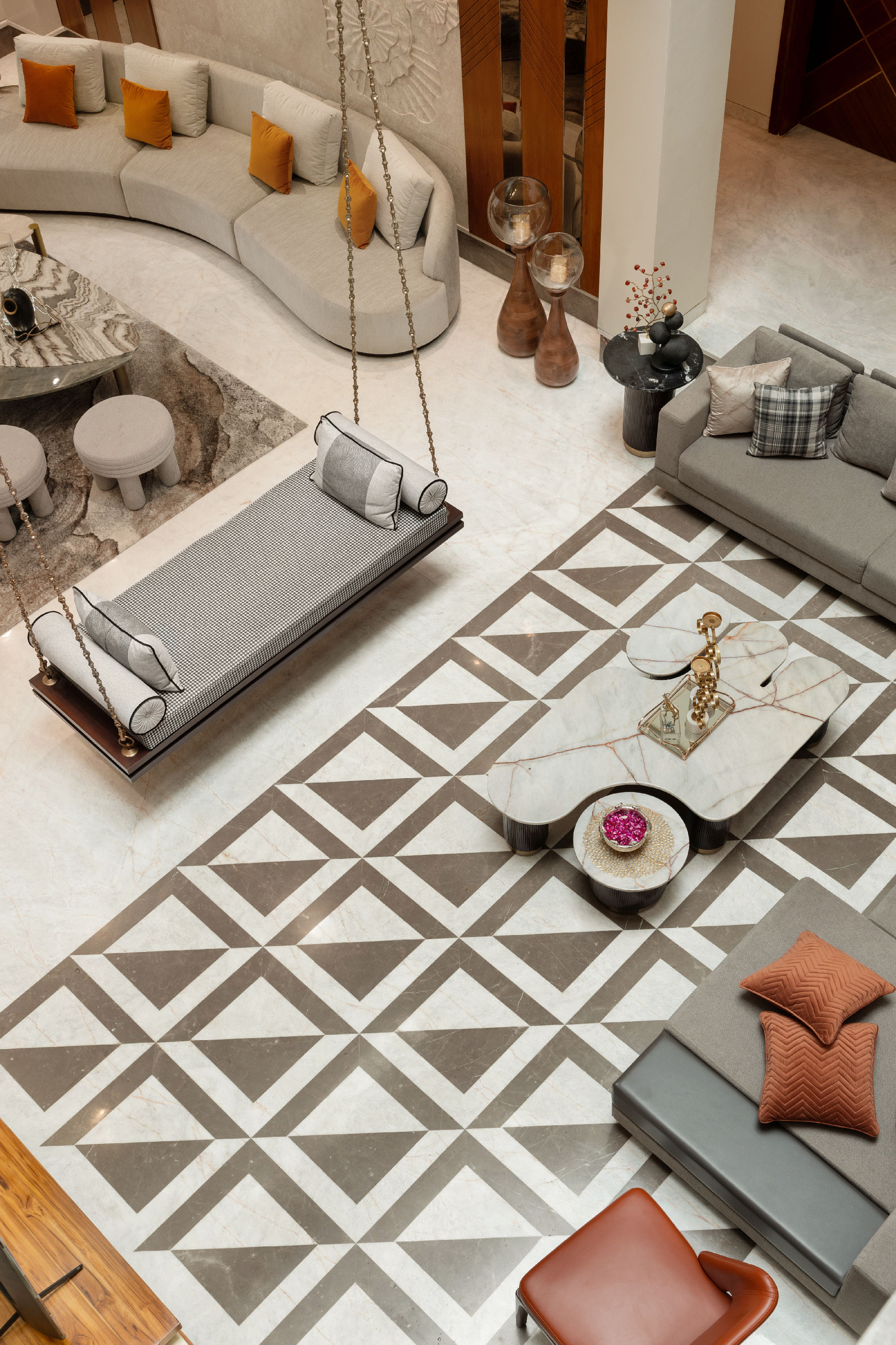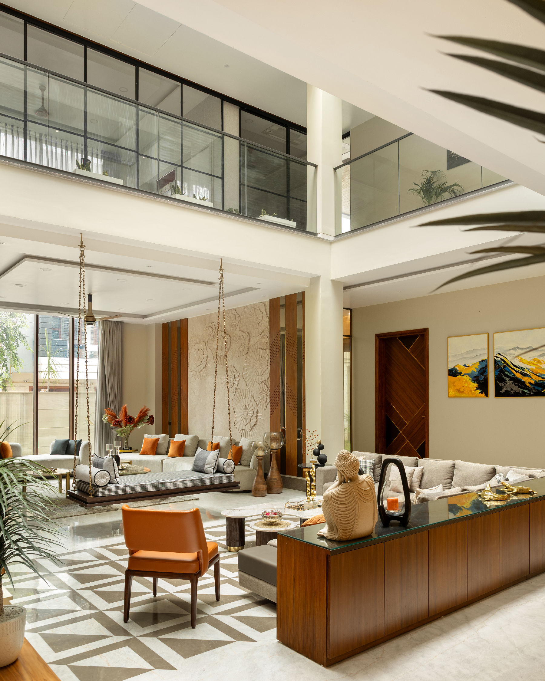 The jhoola became the centrepiece of the double-height living space, framed by a mix of stone walls, intricate floor inlays, warm veneers, matte brass details, wall murals, mirrors, and textured finishes. The formal living room retained a stately elegance, while the lounge invited relaxation, all tied together with cohesive styling.