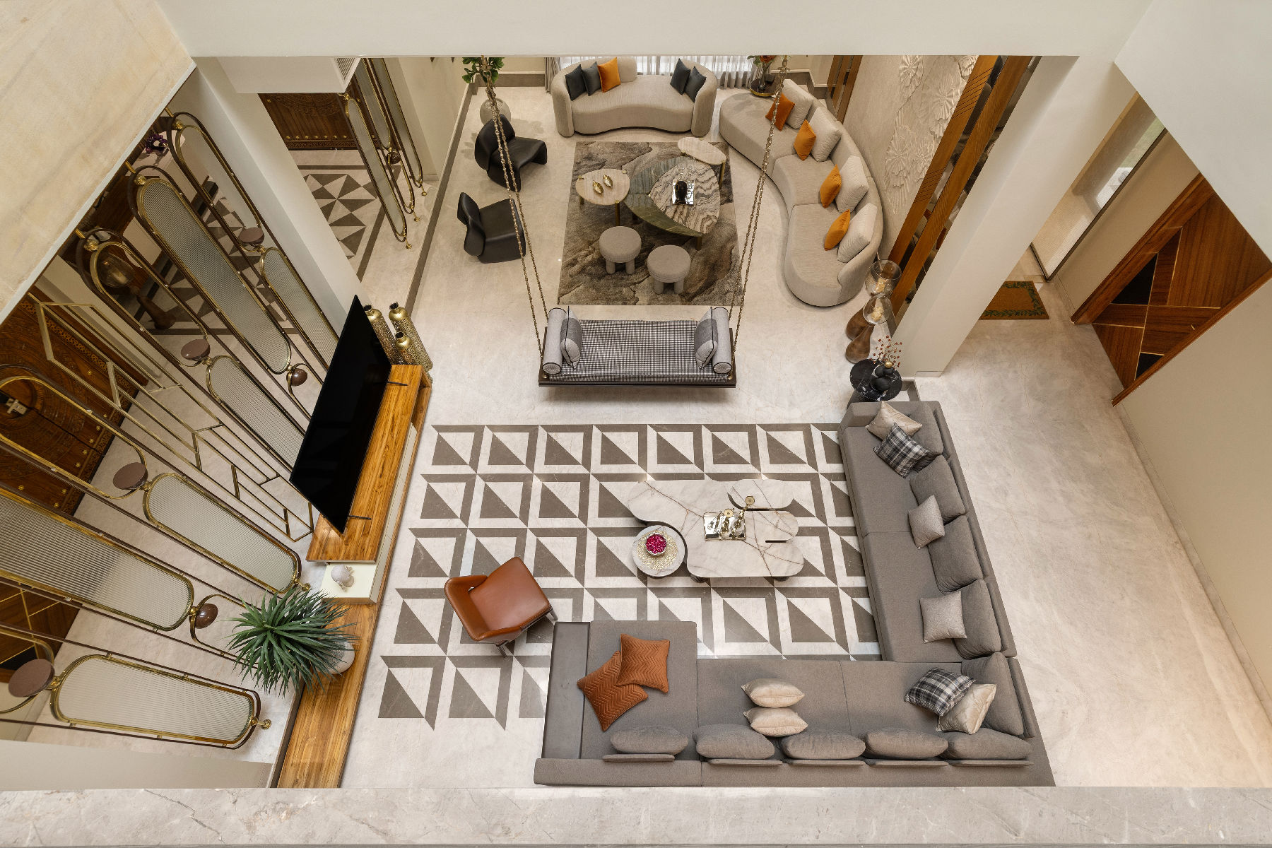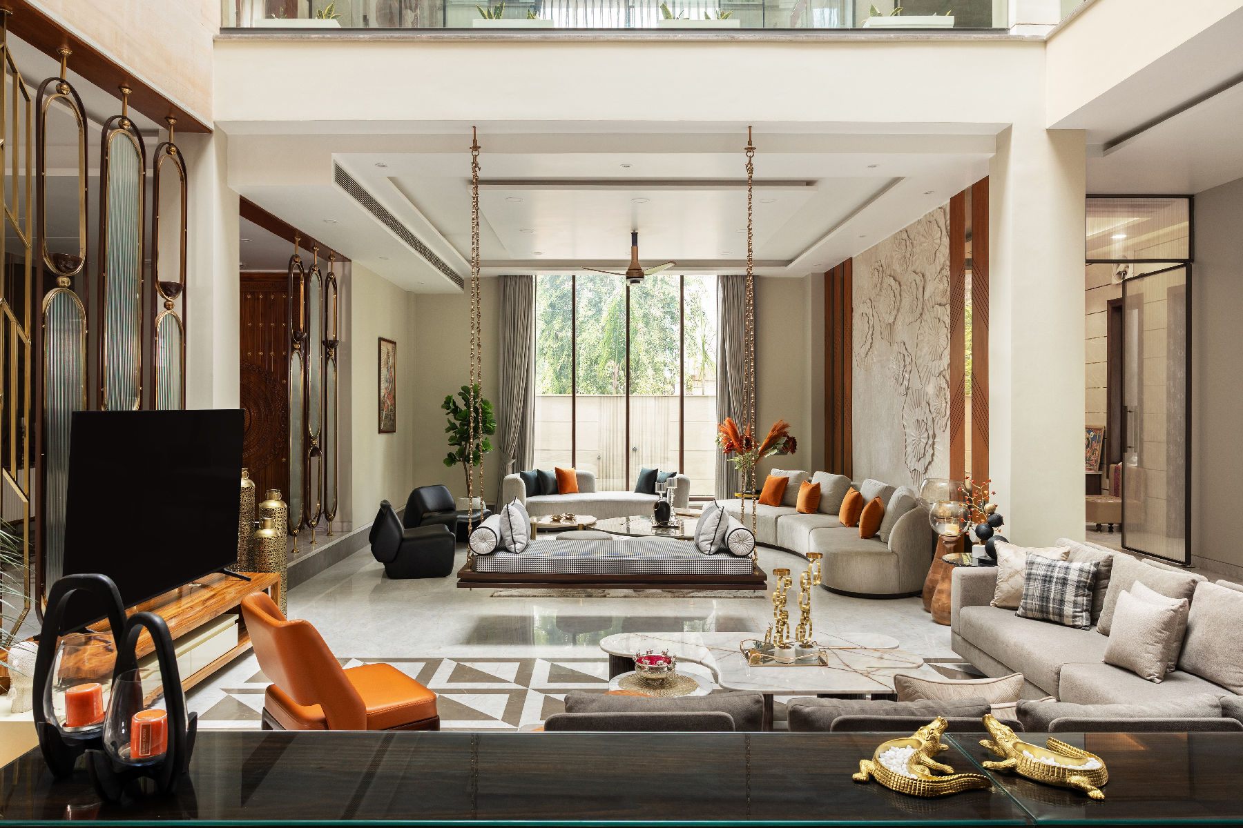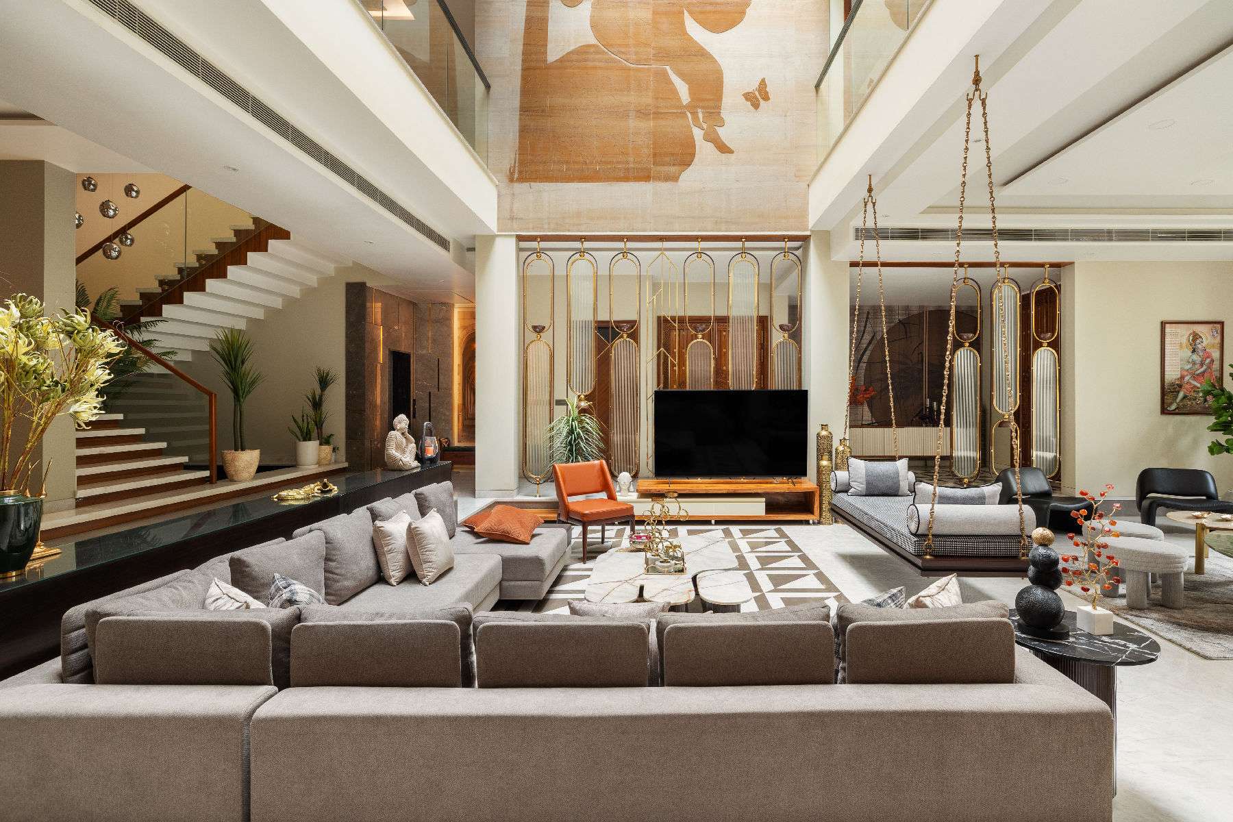The jhoola became the centrepiece of the double-height living space, framed by a mix of stone walls, intricate floor inlays, warm veneers, matte brass details, wall murals, mirrors, and textured finishes. The formal living room retained a stately elegance, while the lounge invited relaxation, all tied together with cohesive styling.